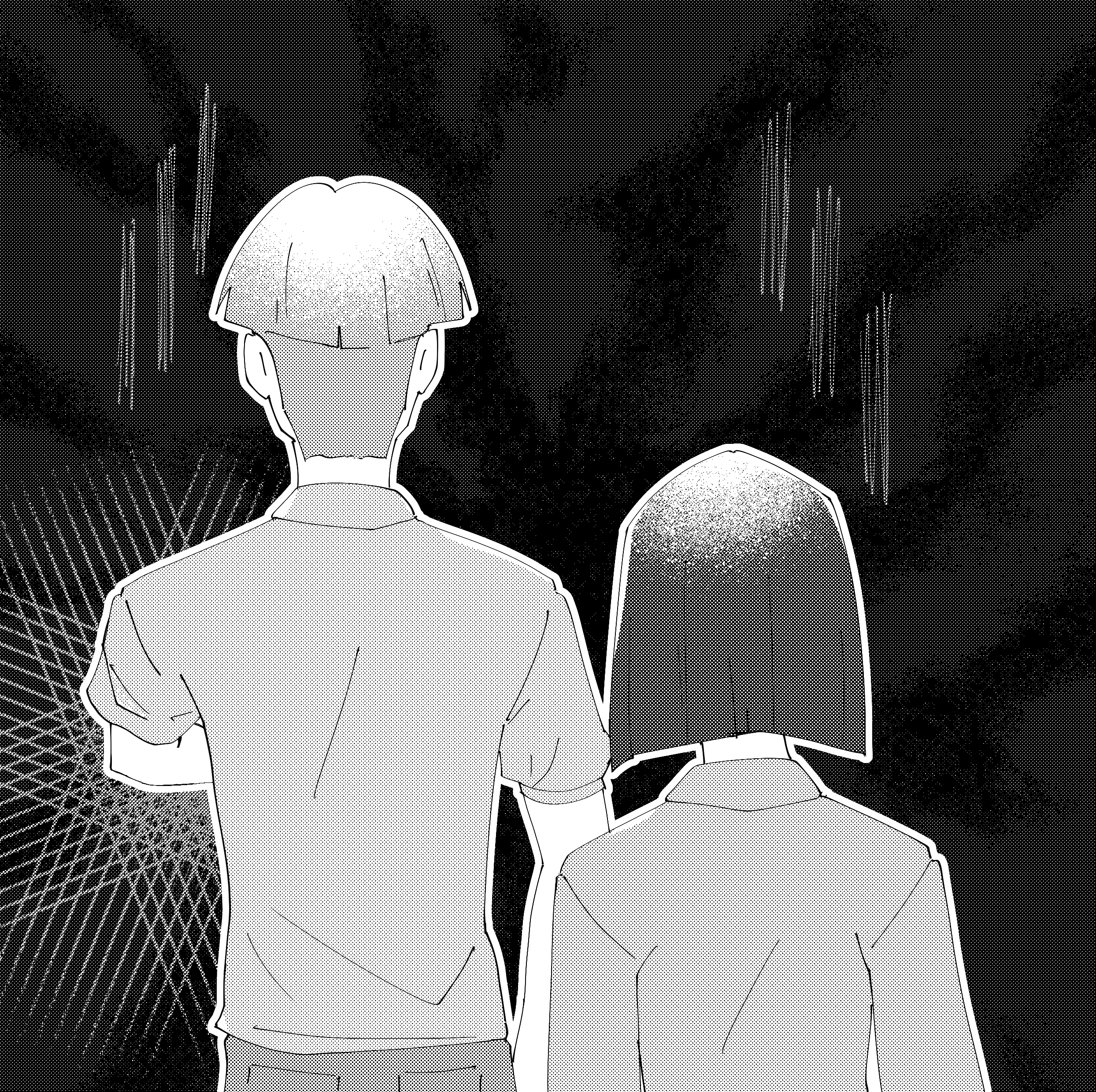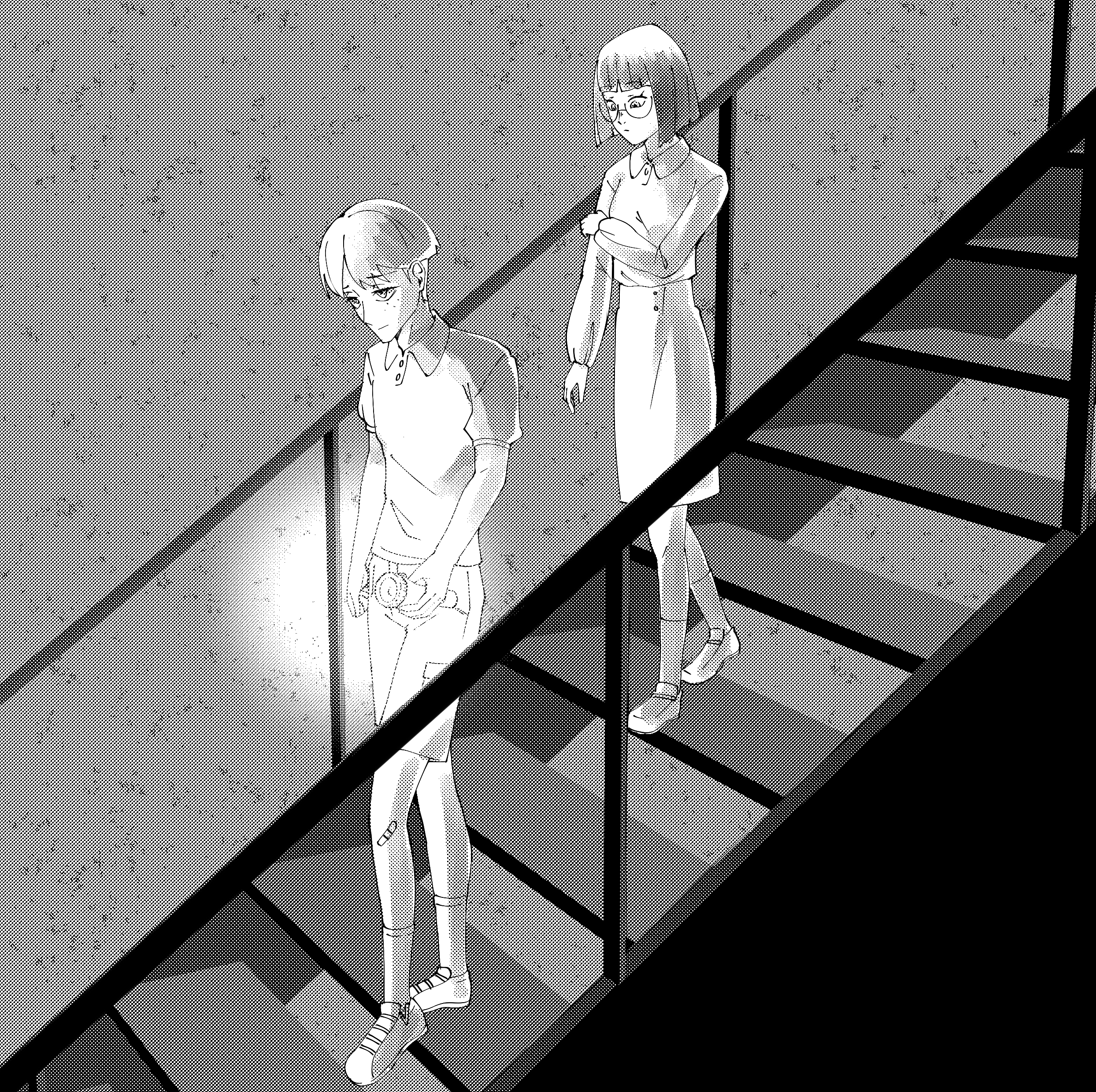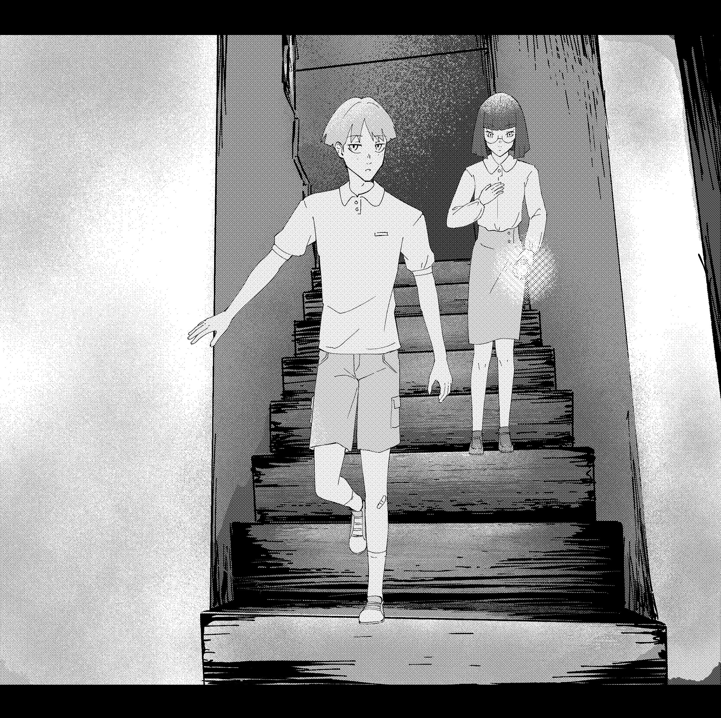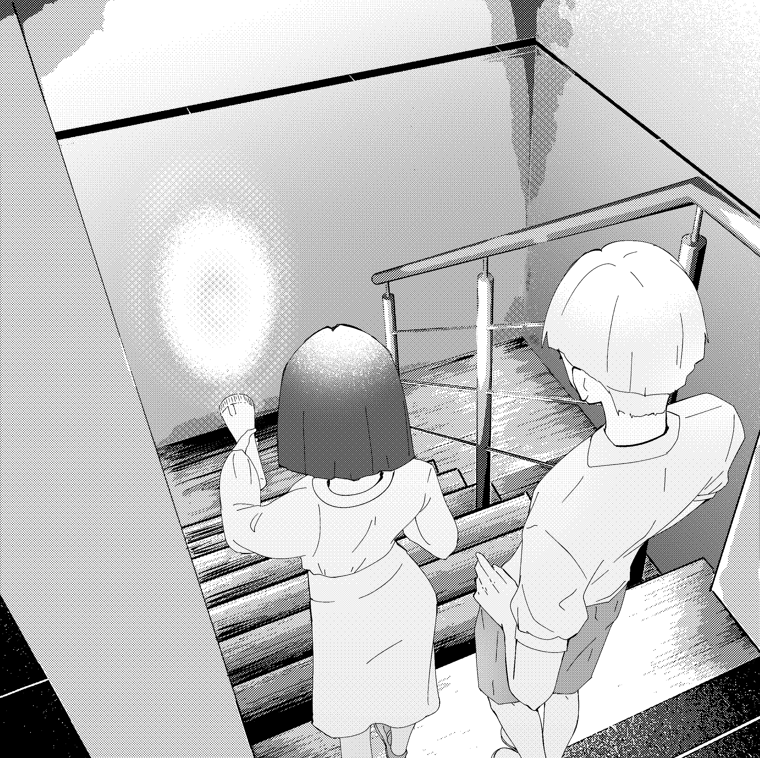 They begin to walk again, one careful step at a time. The beam of light creeps ahead of them as the stairwell closes in, shadows stretching and swallowing them as they descend.