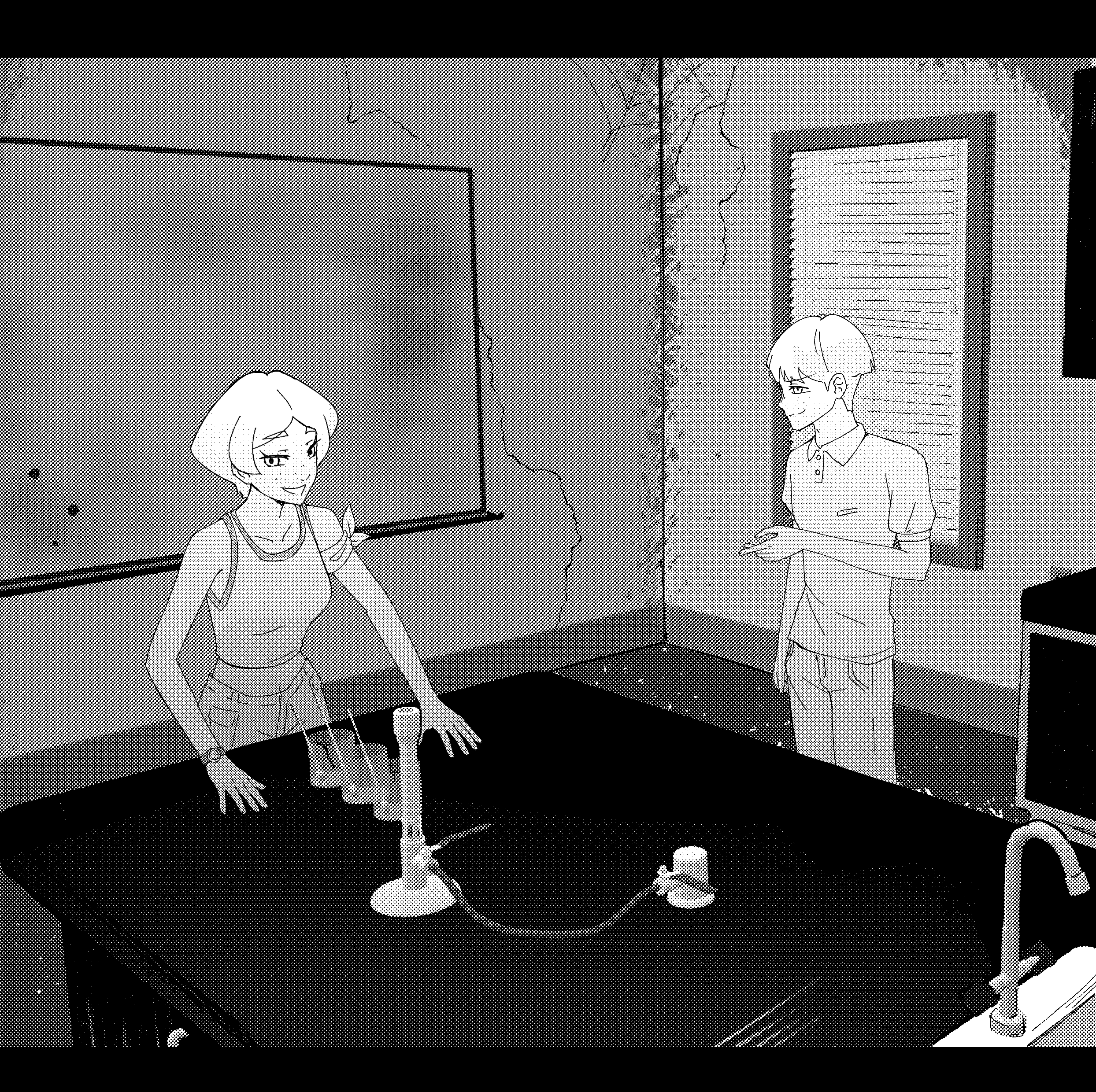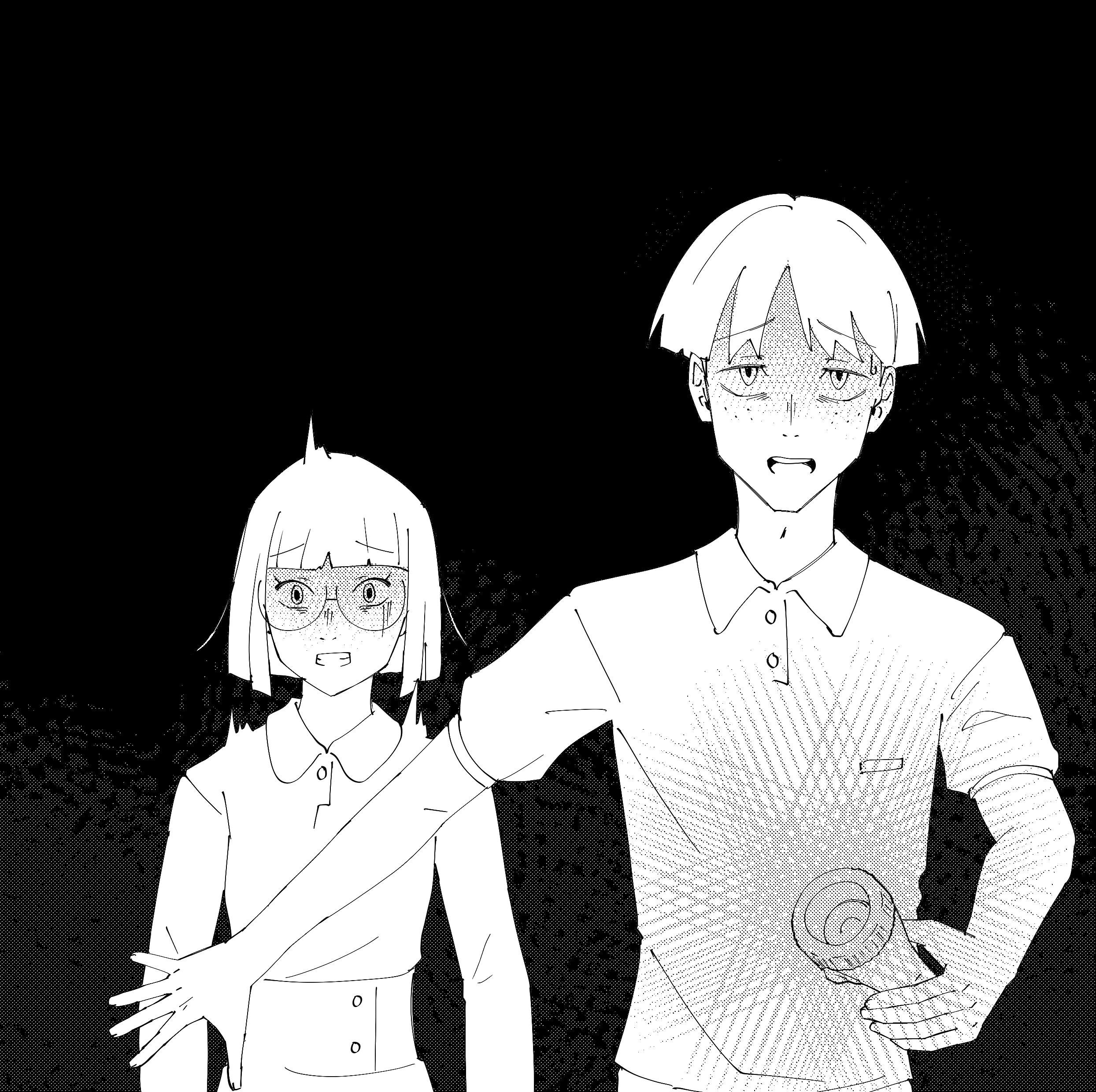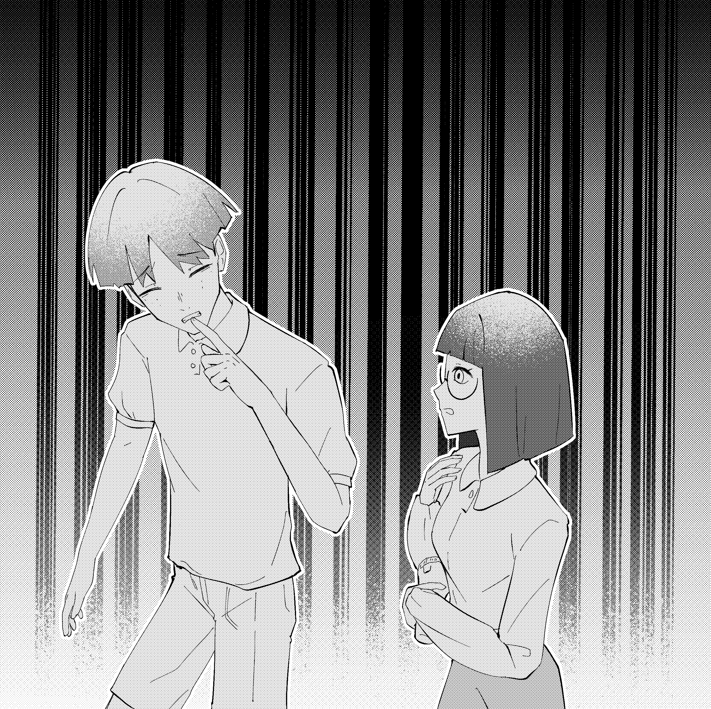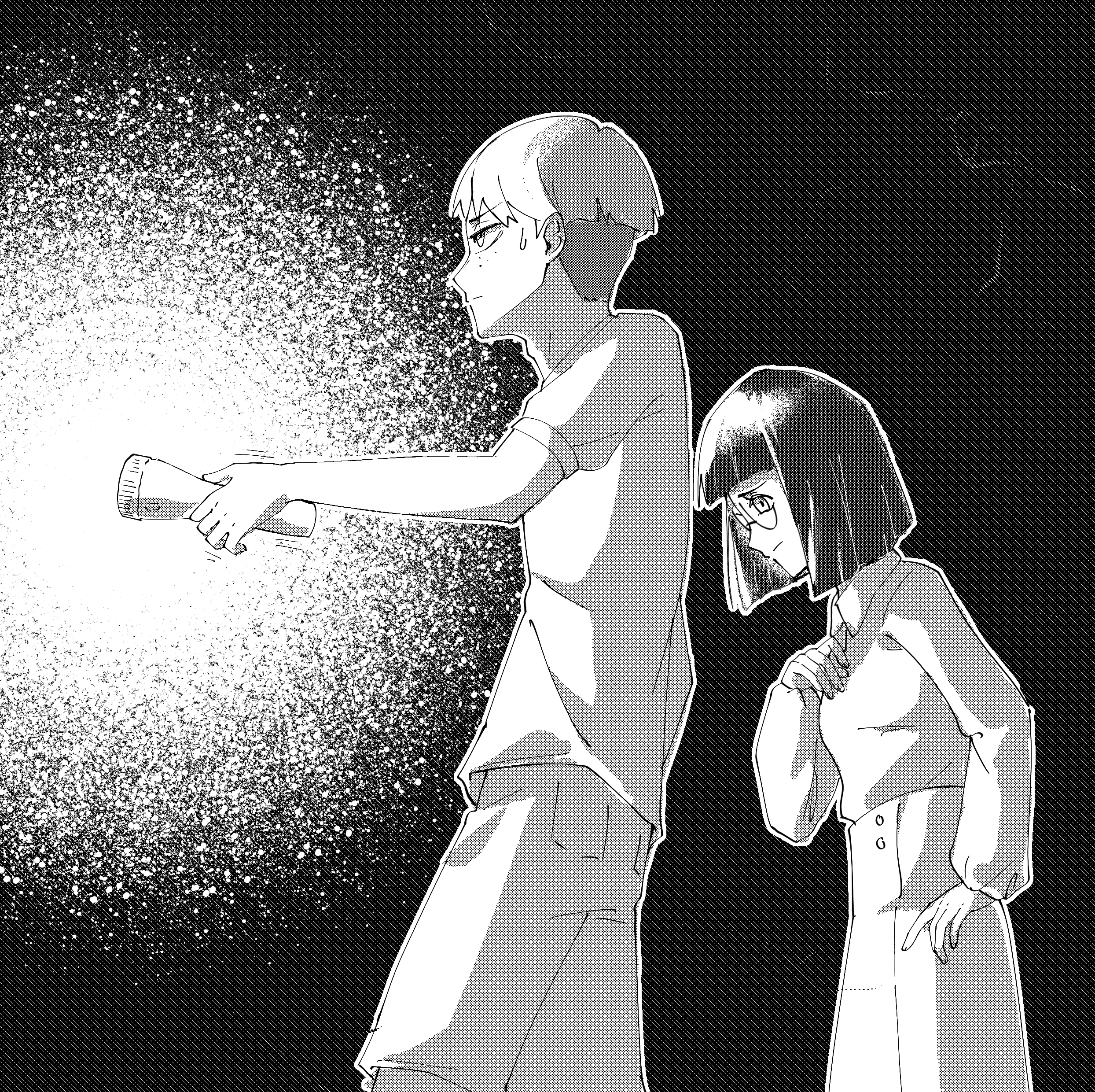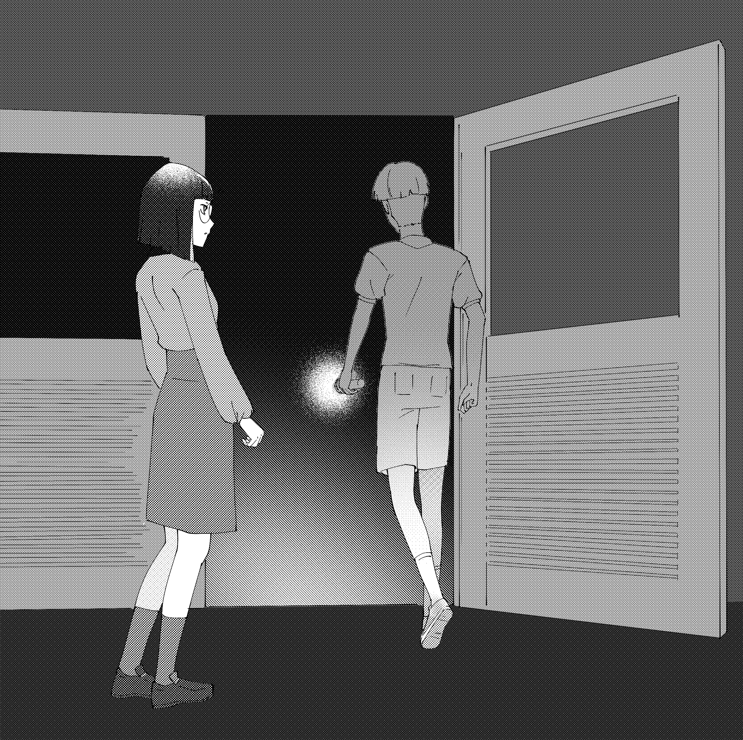 They wander through the derelict school, slowly inching their way deeper into its winding depths. Darkness presses in around them, thick and suffocating, their single beam of light the only relief from its grasp.
