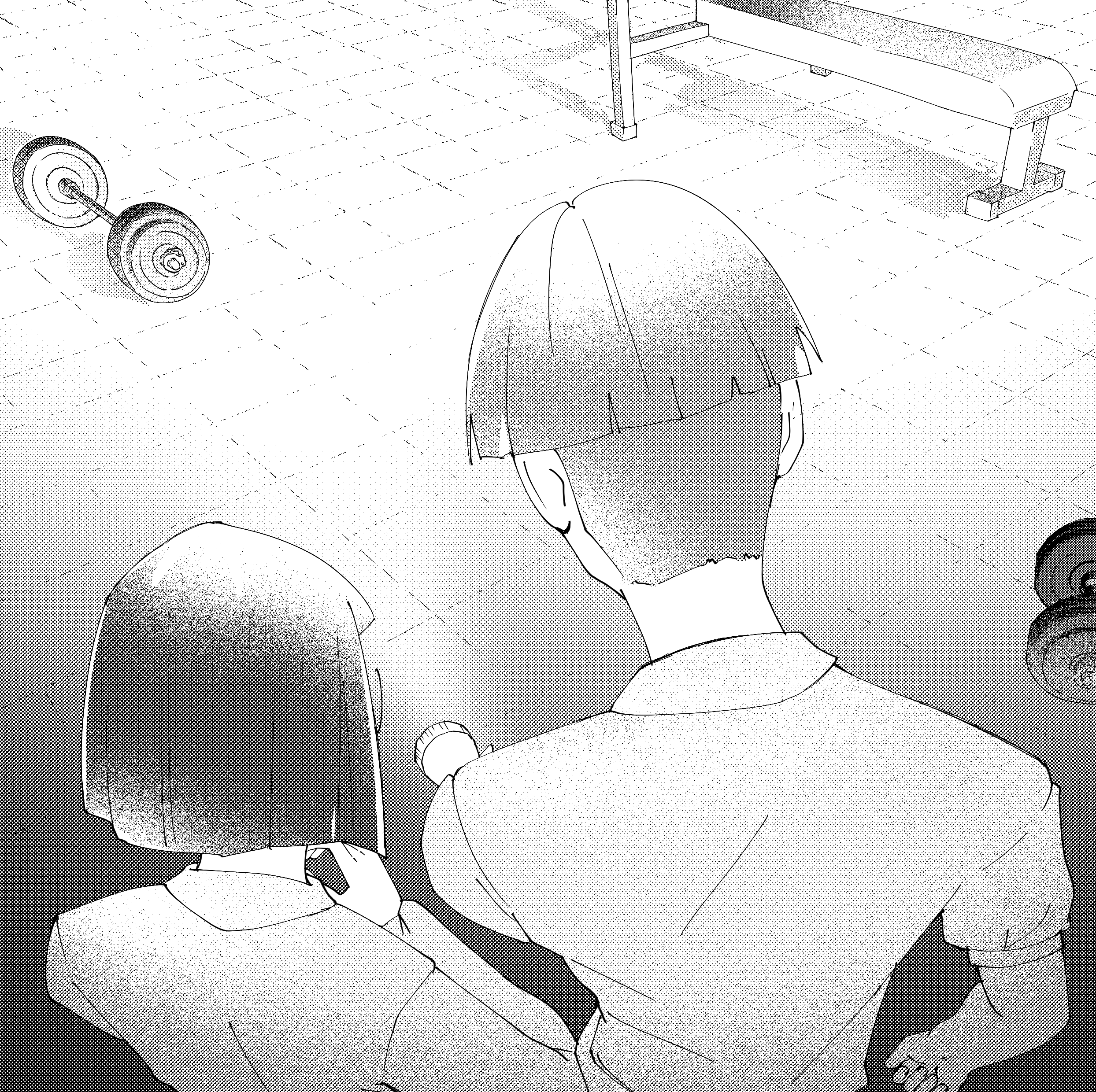 It appears that this was once some sort of athletic room. Abandoned weights and rusting dumbbells lie scattered across the floor. Pieces of toppled gym equipment rest where they fell, like forgotten relics left behind in the dark.