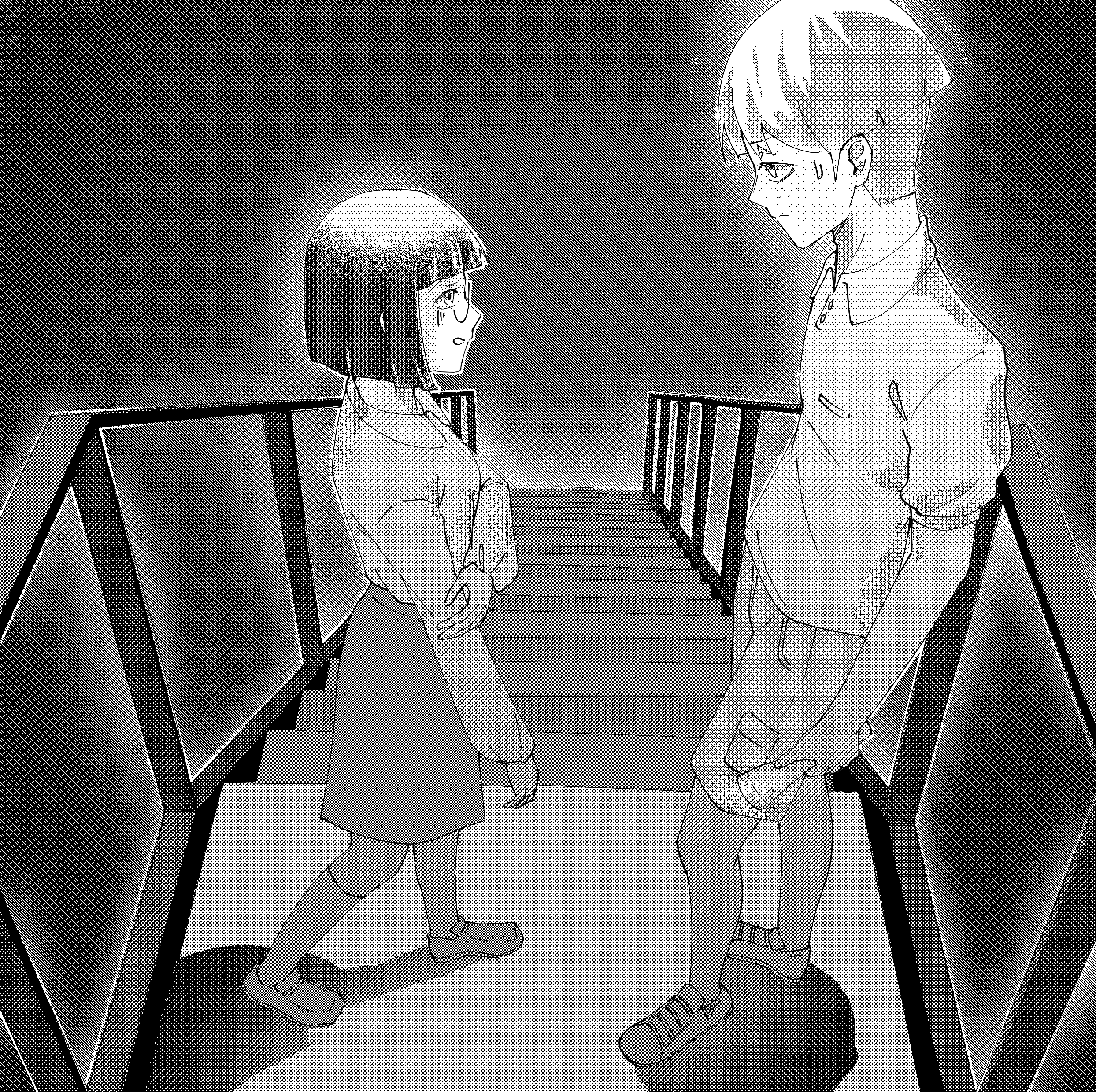 They stand frozen on the staircase. Neither of them dare to breathe too loudly.