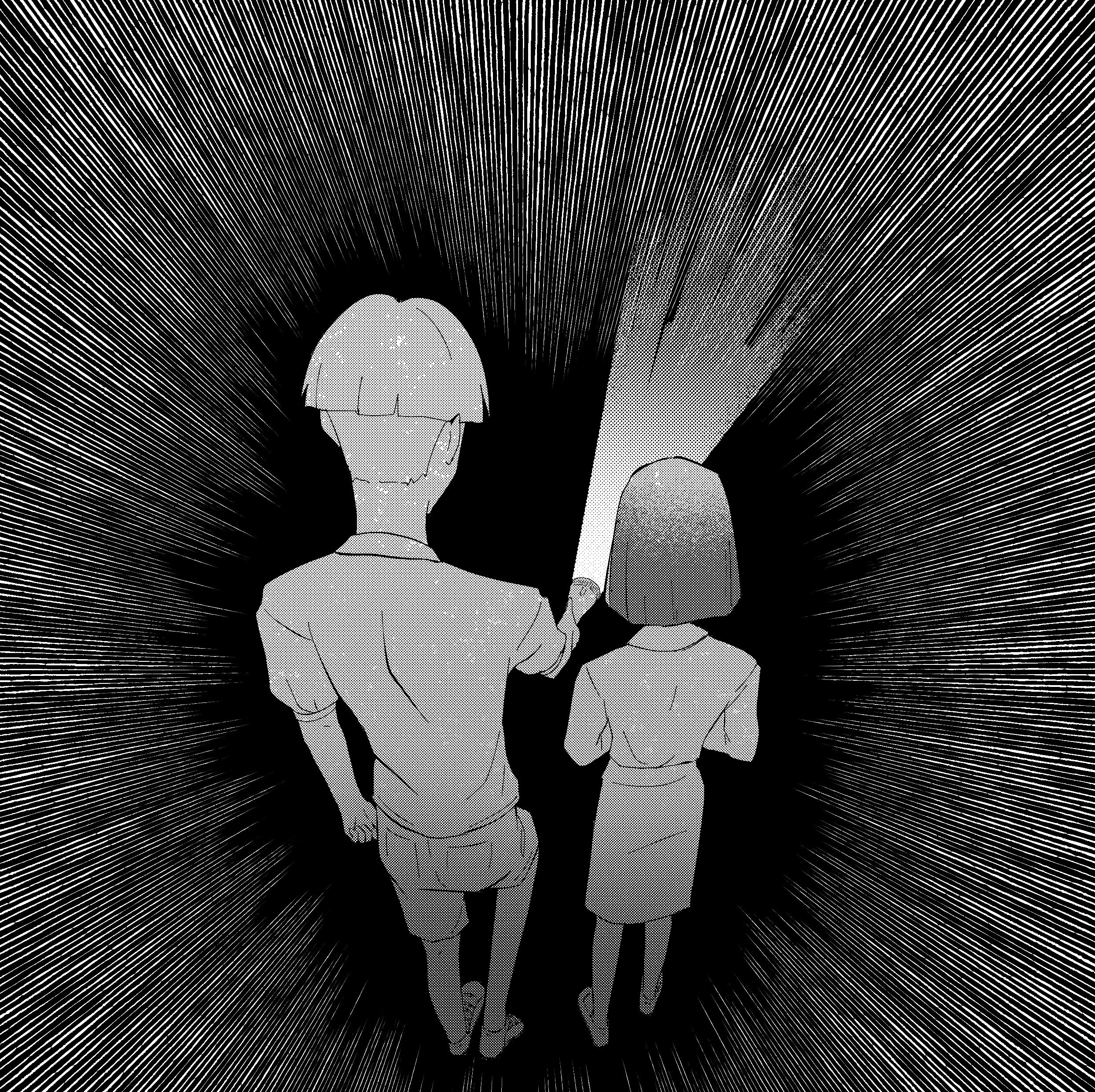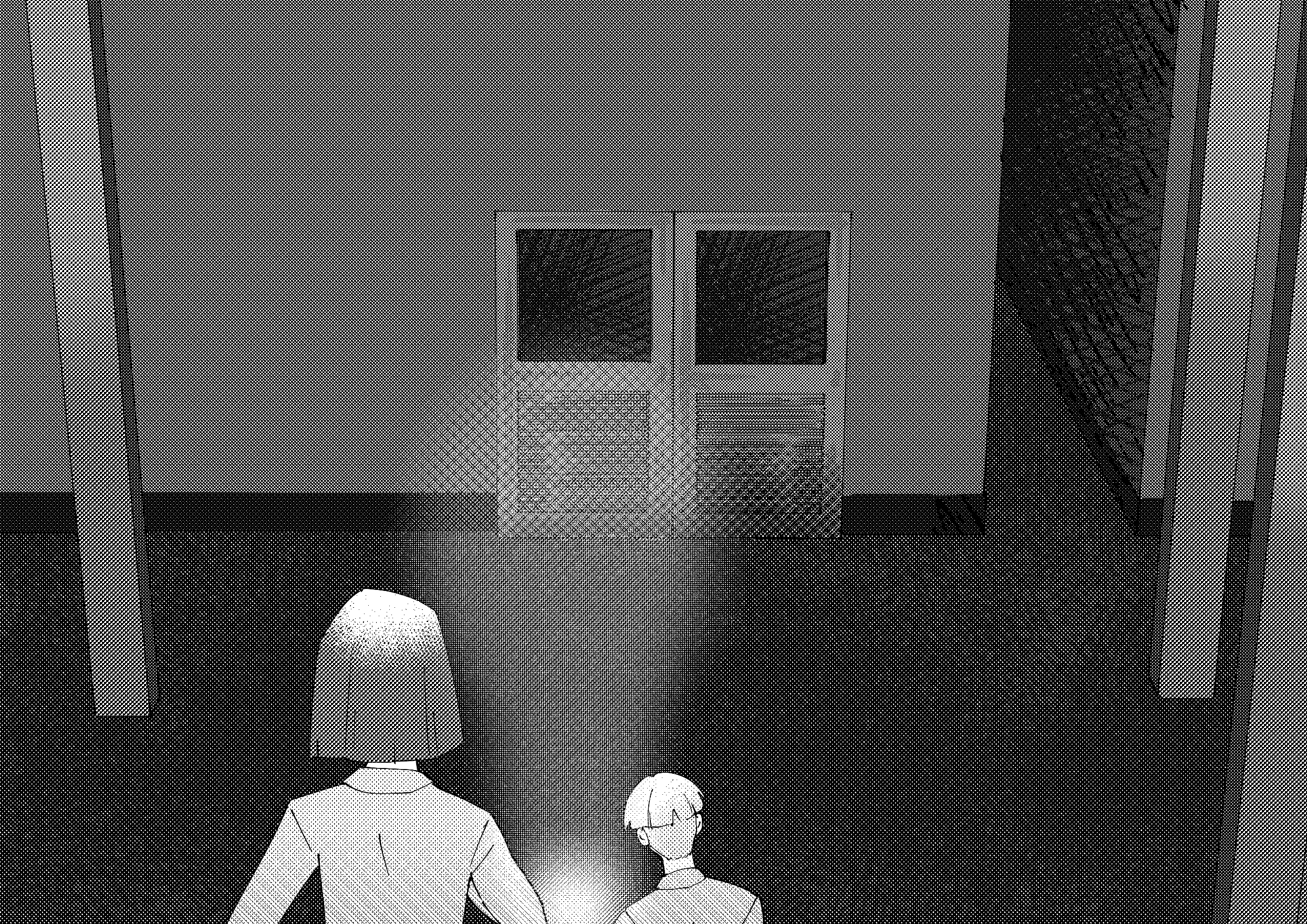 But just as hope begins to bloom, their faces twist back into horror. A large, shadowy figure steps into the doorway, blocking most of the light.