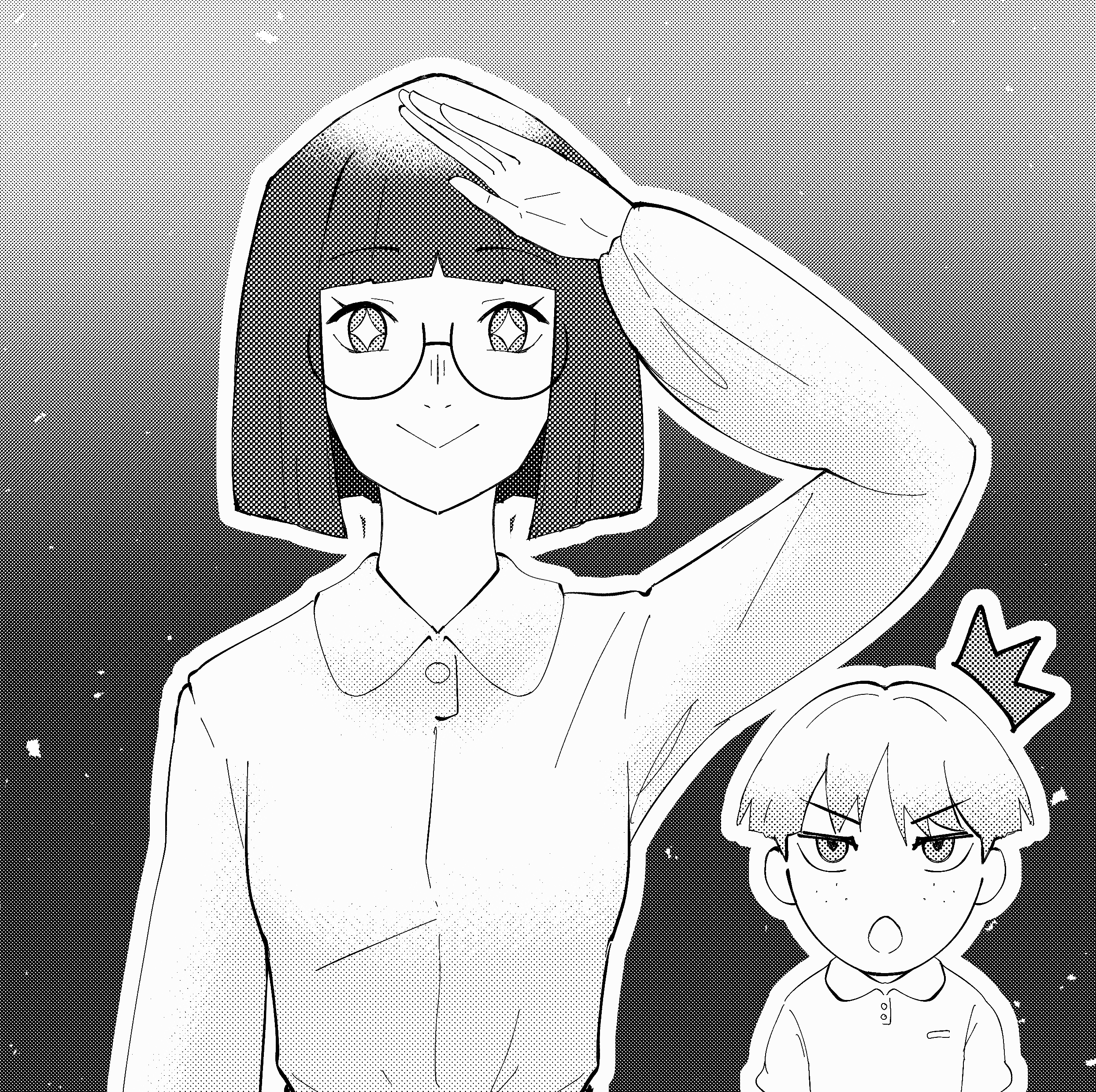 Kim suddenly springs to her feet, the chair screeching as it tips and clatters to the floor behind her. She snaps into a sharp, exaggerated salute, standing stiff as a board, eyes blazing with unshakable determination.
